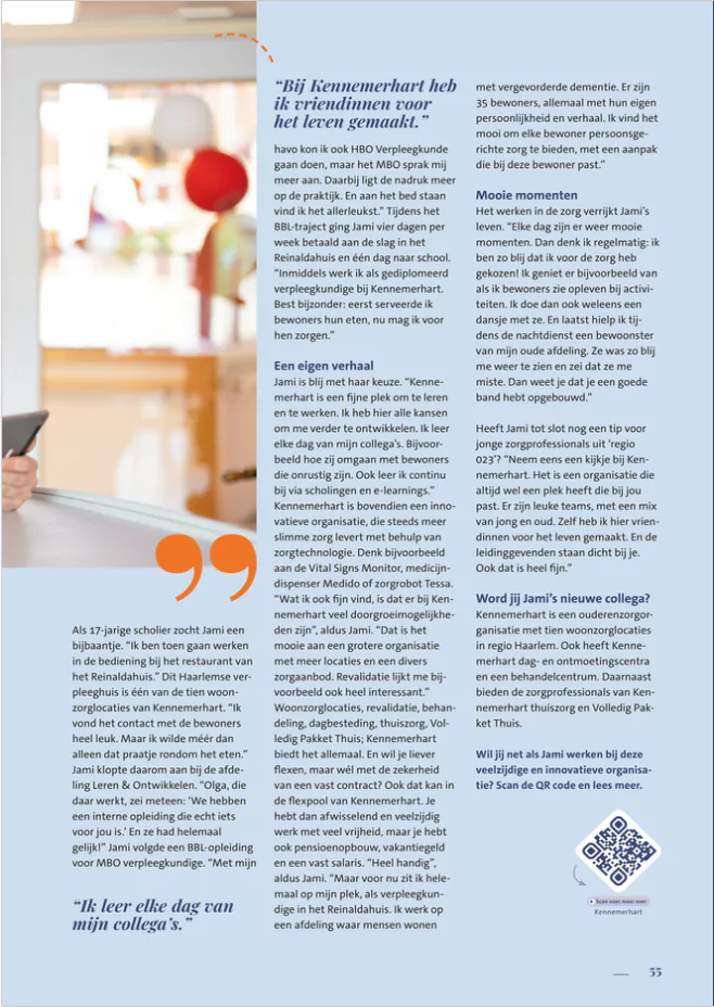 Collega Jami vertelt in het Medivacature Magazine waarom ze als verpleegkundige helemaal op haar plek zit bij het Reinaldahuis. Het begon met een bijbaantje in het restaurant. Inmiddels is de 23-jarige Jami Martin gediplomeerd verpleegkundige bij Kennemerhart. “Ik heb hier alle kansen om me verder te ontwikkelen.” Lees haar verhaal hieronder.