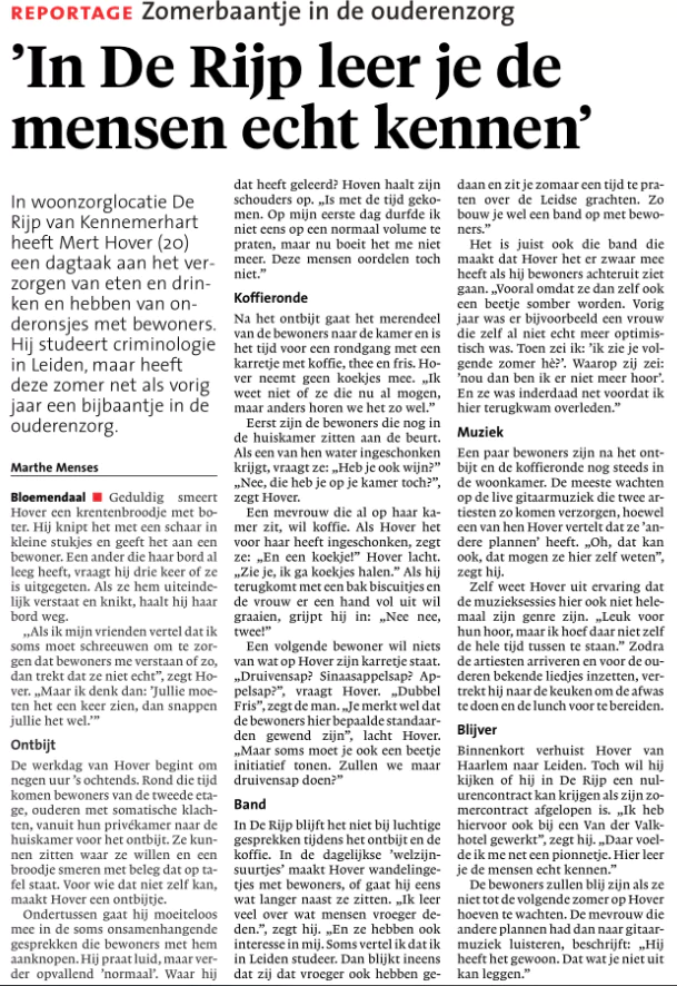 Het Haarlems Dagblad liep voor een reportage over zomerbaantjes een ochtendje mee met vakantiekracht Mert. Hij is naast student criminologie ook vakantiekracht bij Kennemerhart woonzorglocatie De Rijp.